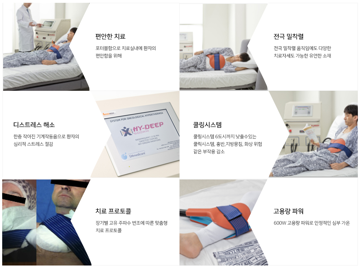 하이딥 600WM의 Flexible한 양전극은, 치료 환부를 안정적으로 감싸주고 13.56MHz의 고주파를 이용해 심부에 위치한 조직 분자들의 생체열을 발생시켜 상대적으로 열에 약한 암 조직을 파괴하는 원리를 이용한 의료용 암 치료 장비